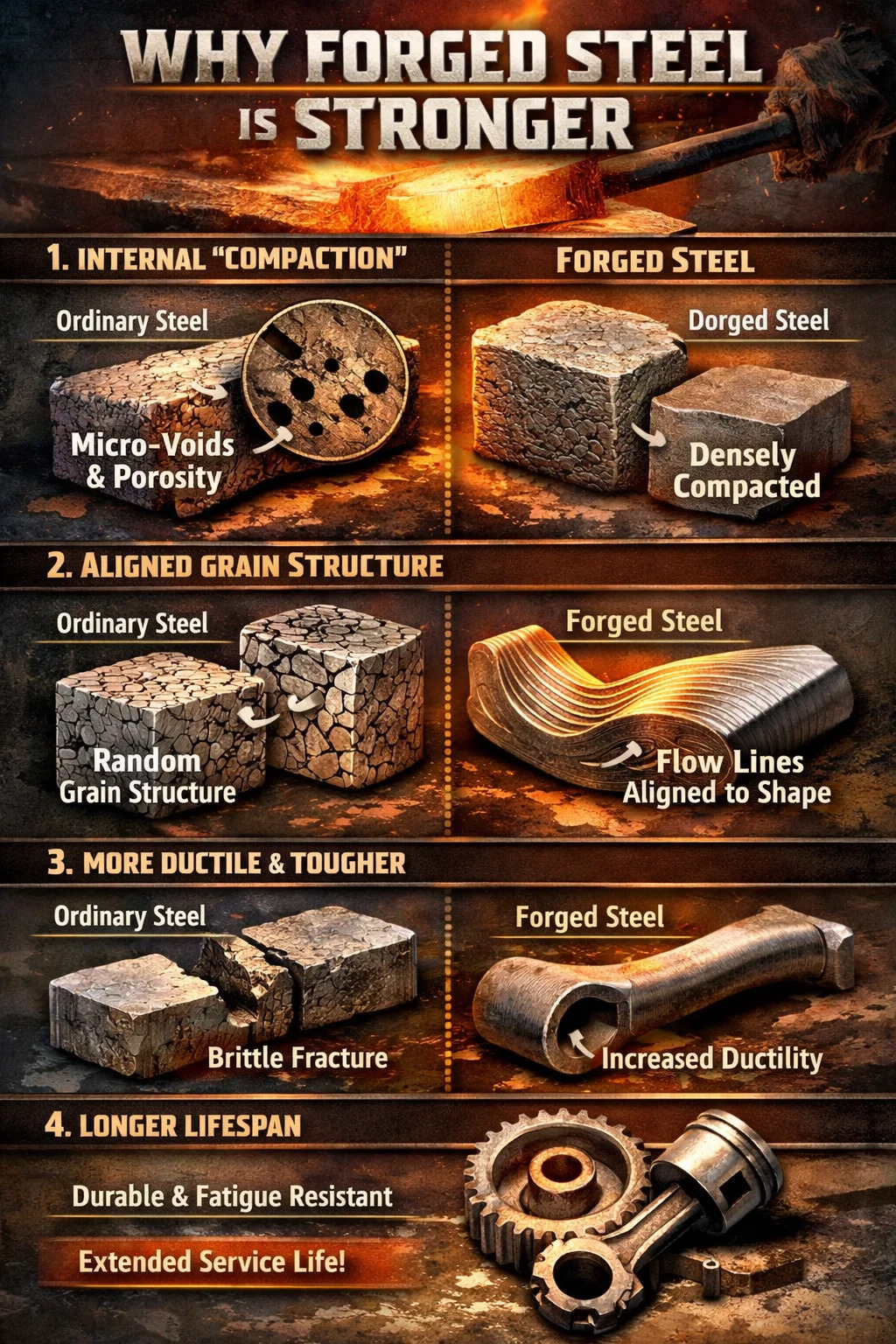 Gesmeed staal: Onder enorme druk worden deze kleine poriën volledig afgeplat en aan elkaar gelast, waardoor het hele stuk metaal zo dicht wordt als een massief blok. Zonder interne defecten is het onderdeel van nature sterker.