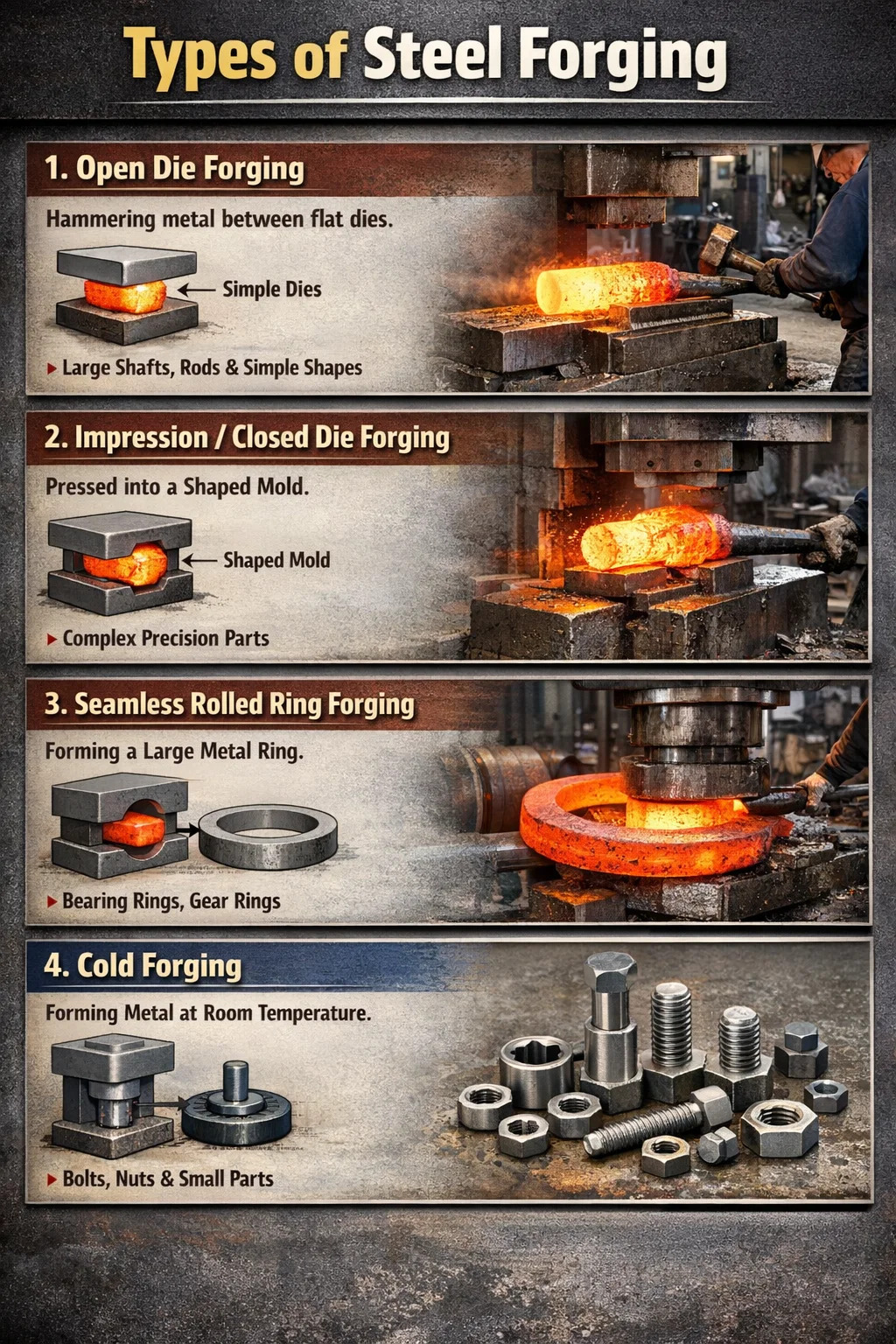 Op het gebied van metaalverwerking zijn er veel verschillende smeedprocessen. Volgens de meest gebruikelijke classificatiemethode, staal smeden kan doorgaans worden onderverdeeld in de volgende vier categorieën: