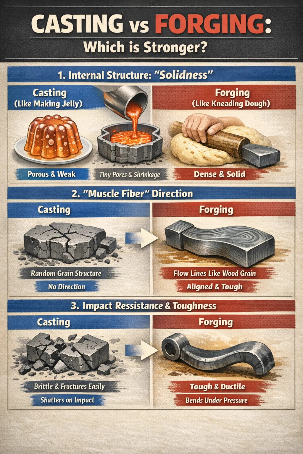 Als we metaal vergelijken met voedselingrediënten, is gieten zoiets als 'gelei maken' staal smeden is als 'deeg kneden'. Hoewel beide de gewenste vorm kunnen creëren, zijn de interne dichtheid en slagvastheid totaal verschillend.