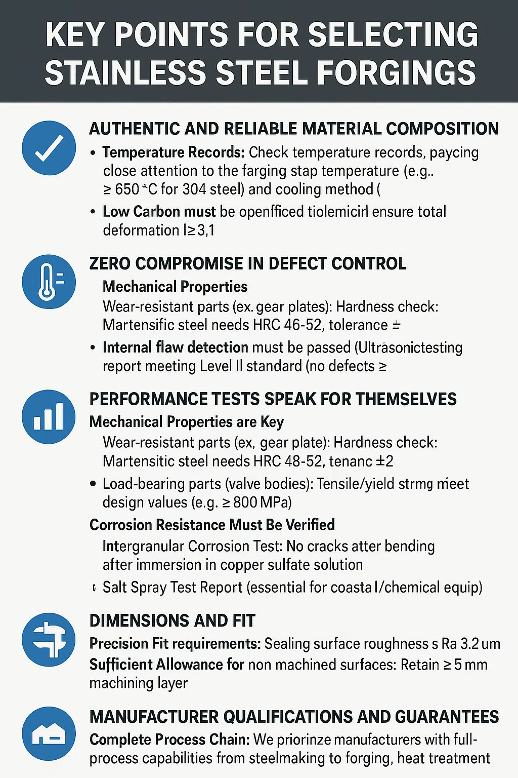 Temperatuurregistraties moeten worden gecontroleerd: Vraag verwarmingscurves aan, waarbij u goed let op de stoptemperatuur van het smeden (bijv. ≥850 ℃ voor 304 staal) en de koelmethode (waterdoving/langzame koeling).